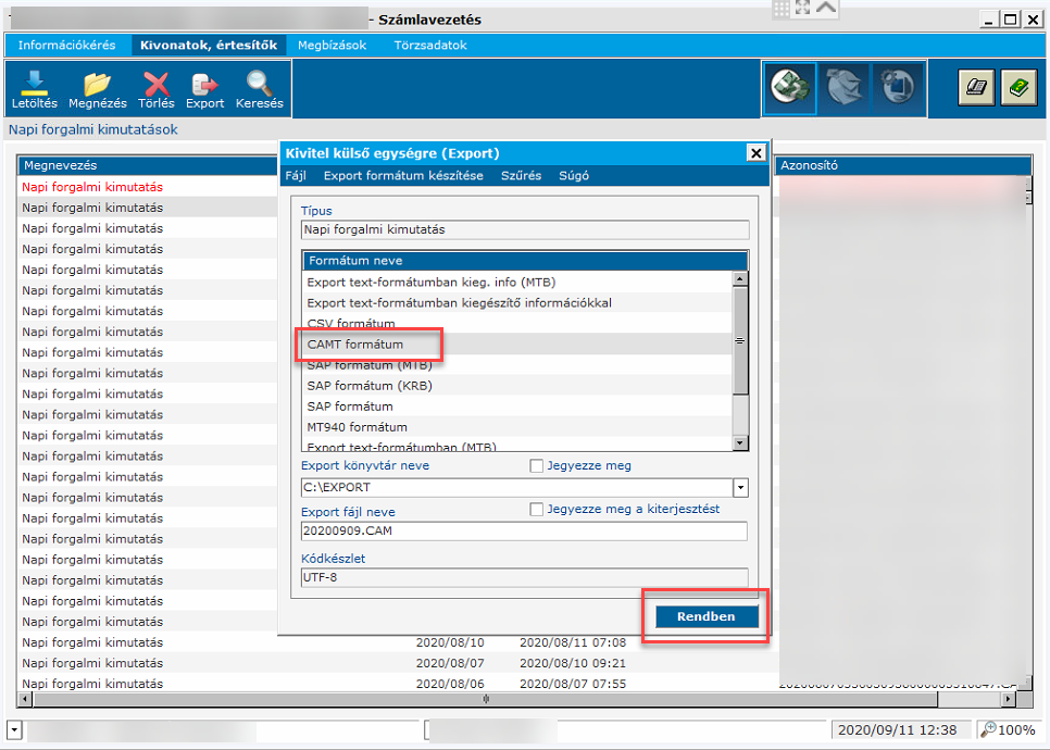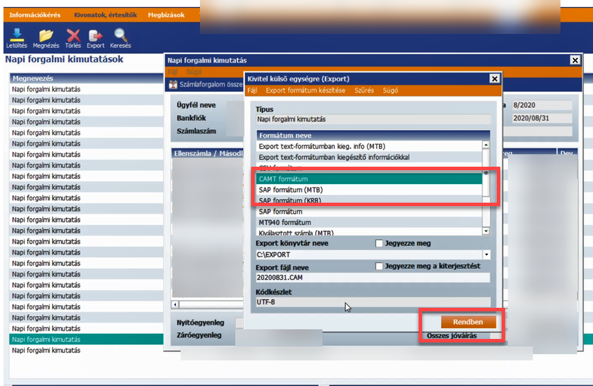 Kivonatok,értesítők menüpont Napi forgalmi kimutatások a kis felugró ablakban CAMT formátum Alapesetben a C:/EXPORT mappába menti. Ha szeretnénk más mappába tenni akkor az “Export könyvtár neve”-nél a lefele nyilacskára kattintva ki lehet választani más mappát. MKB Bank Business(STM)