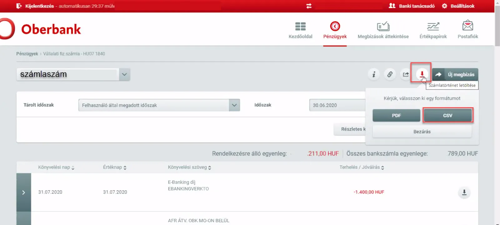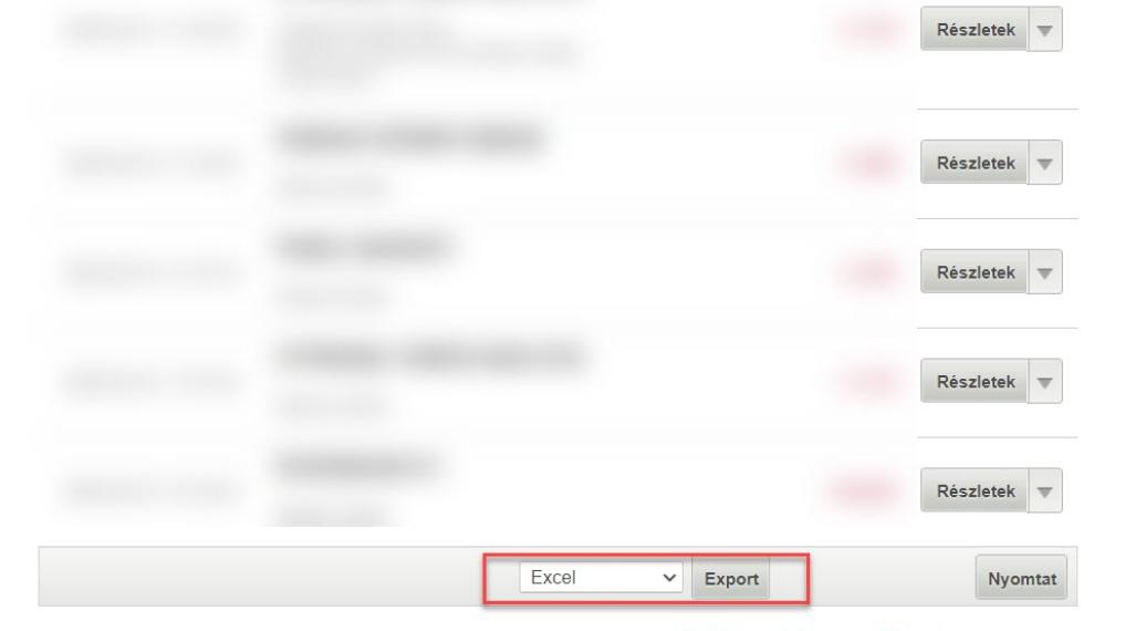 Főmenüben: Tevékenységek menüpont kiválasztása tranzakció típusának kiválasztása Alább megjelenik a lekérdezett időszak adata Műveleteknél Letöltésre katt
