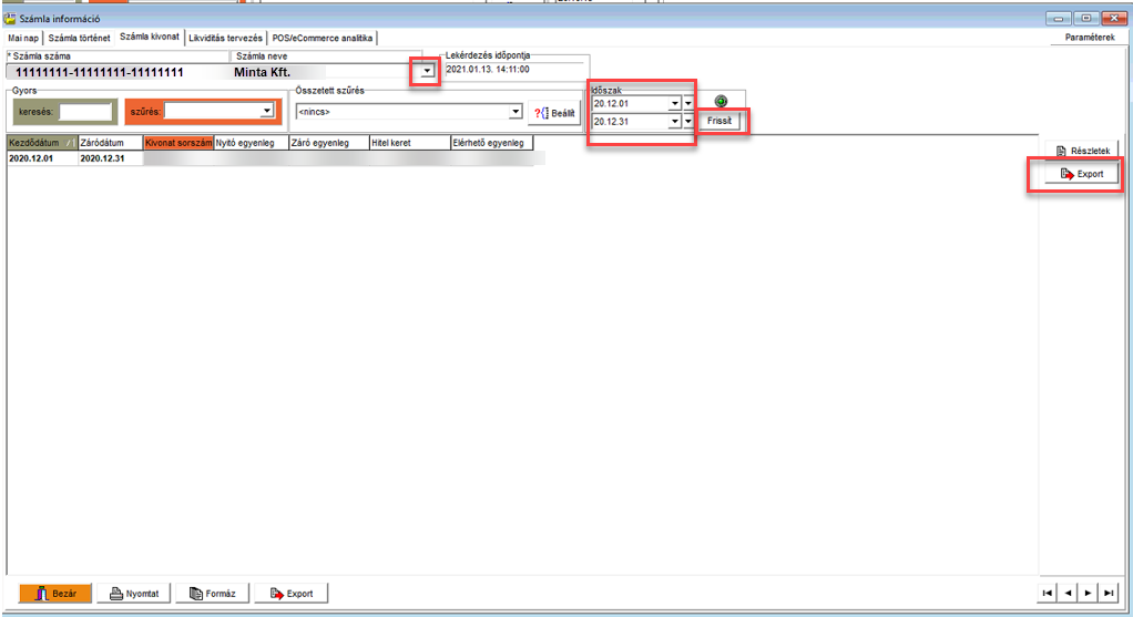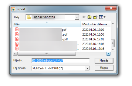 Válasszuk ki a lekérdezni kívánt bankszámlát Válasszuk ki az időszakot Az időszakban keletkezett kivonatokat mentsük le az Export gombra kattintva, az MT940 formátum (windows) opciót választva
