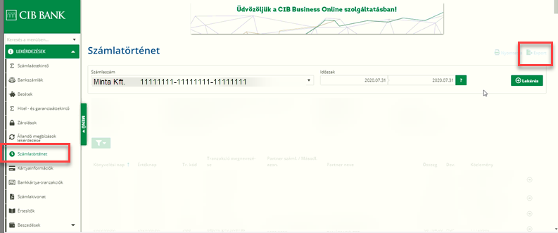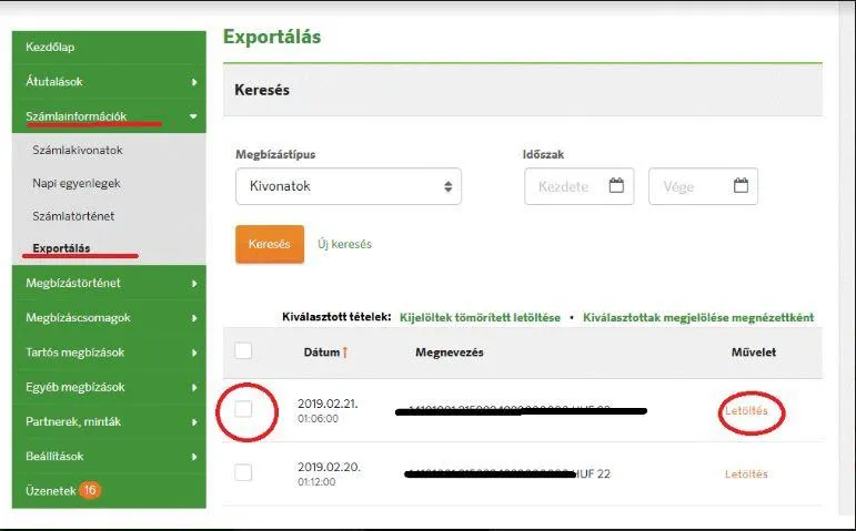 Információk - Számlatörténet - (a számla és az időszak kiválasztása) majd rendben gomb. Ezután a jobb felső sarokban a floppy ikonnal lehet exportálni Számlaforgalom formátumban.