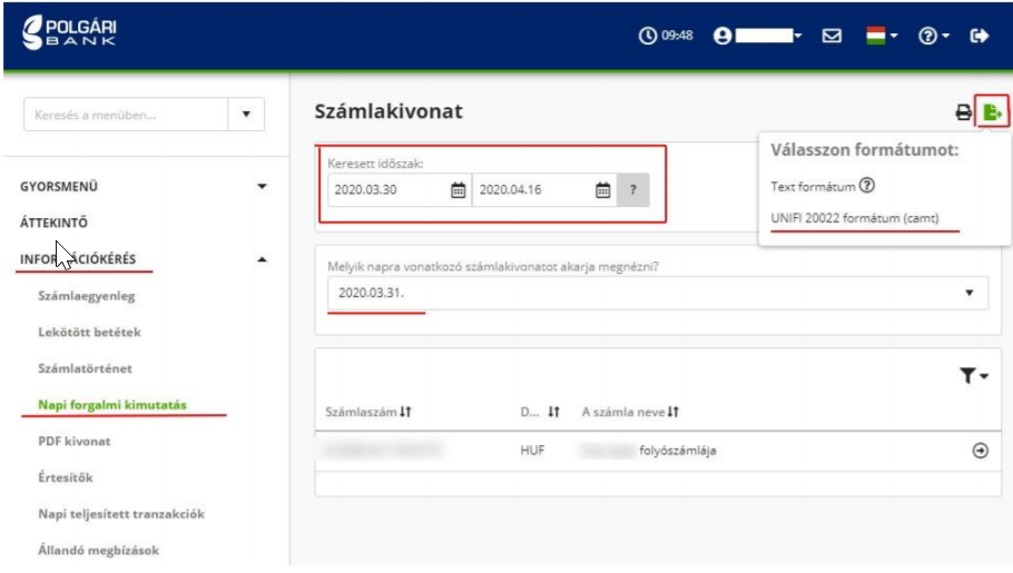 Bal oldali fő menüben: Információkérés Lekérdezni kívánt időszak beállítása (az itt megadott napok jelenek meg a lenti legördülő menüben) Megjelennek azok a kivonatok, amelyeken volt pénzmozgás a számlán. A papír alapú kivonat időszakának megfelelően tudjuk az elektronikus adatokat lementeni. Jobbra fent a kis floppy ikonra kattintva mentsük le a számlakivonatot az UNIFI 20022 formátum (caml) formátumban. (lementés után a fájl kiterjesztése .xml lesz.)