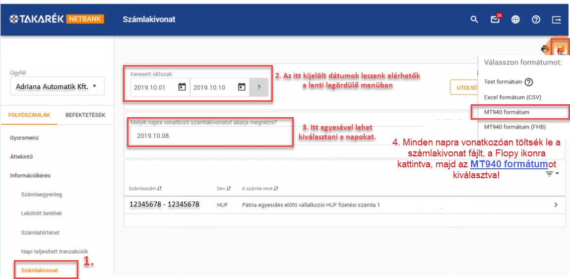 Bal oldali fő menüben: Információkérés Lekérdezni kívánt időszak beállítása (az itt megadott napok jelenek meg a lenti legördülő menüben) Megjelennek azok a napok, amelyeken volt pénzmozgás a számlán. A napokat egyesével lehet kiválasztani. A papír alapú kivonat időszakának megfelelően tudjuk az elektronikus adatokat lementeni. Jobbra fent a kis floppy ikonra kattintva mentsük le a számlakivonatot az MT940 formátumot kiválasztva! (lementés után a fájl kiterjesztése .stm lesz.)