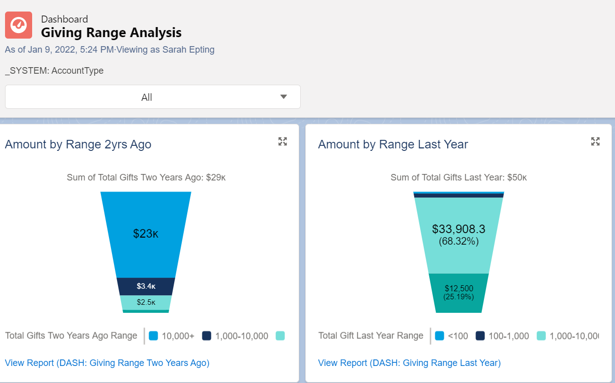 NPSP comes with dozens of useful pre-built reports right out of the box, and we can also build our own custom reports when they are needed. Reports can be accessed by clicking on the Reports tab.