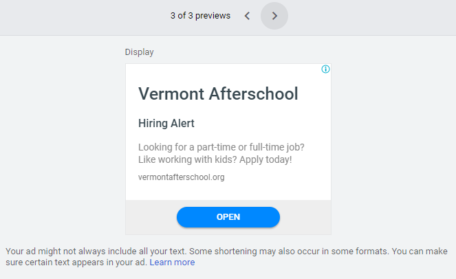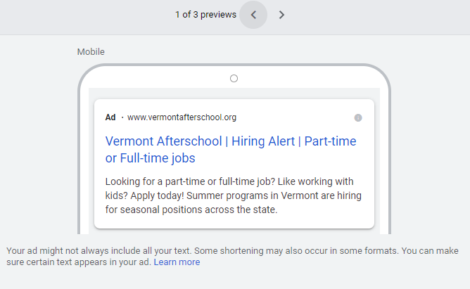 For as little as $500, you can run Google search ads to recruit staff for the summer programs. Two examples of ads are below.