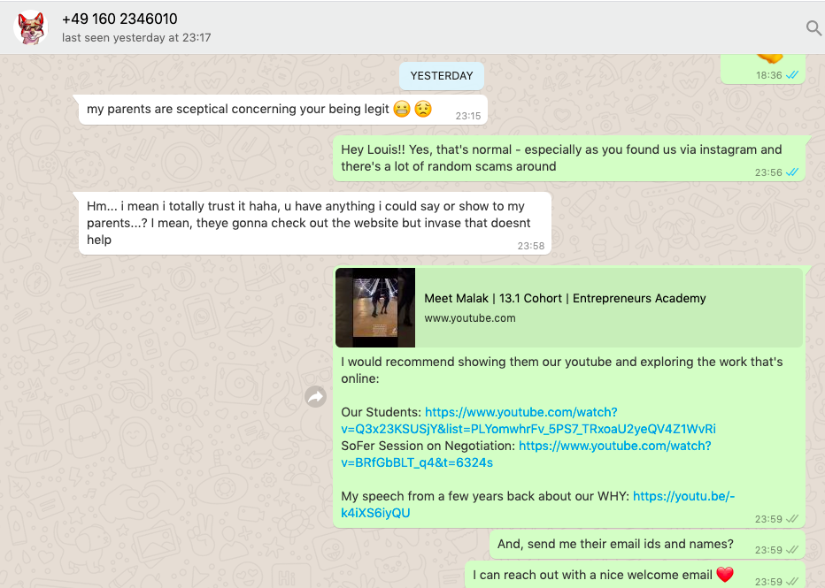 I really enjoyed speaking to you yesterday! 📲 It was wonderful to *get to know you and your vision*. Congrats again on your acceptance into the Entrepreneurs Academy. 14 exceptional teens from UK, S Africa, USA, Canada - have already joined us and we hope you are next to join this amazing group of inspiring 🌏 peers.