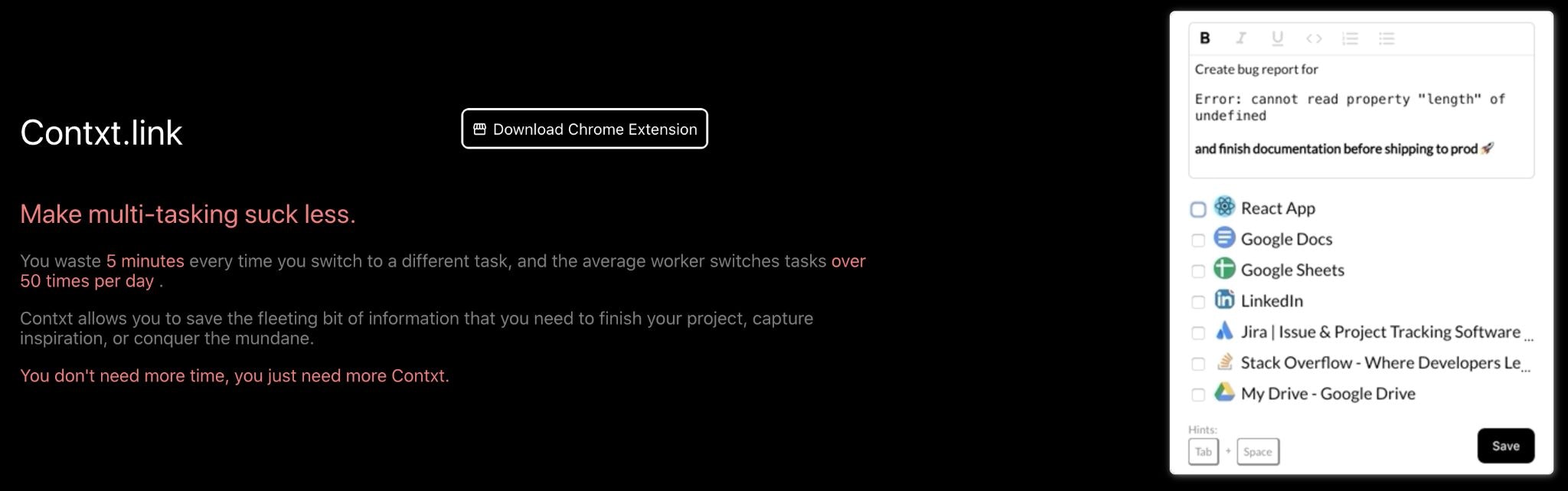 Contxt is a chrome extension and web-app that allows you to resume your flow state by letting your save your tabs and notes for later.