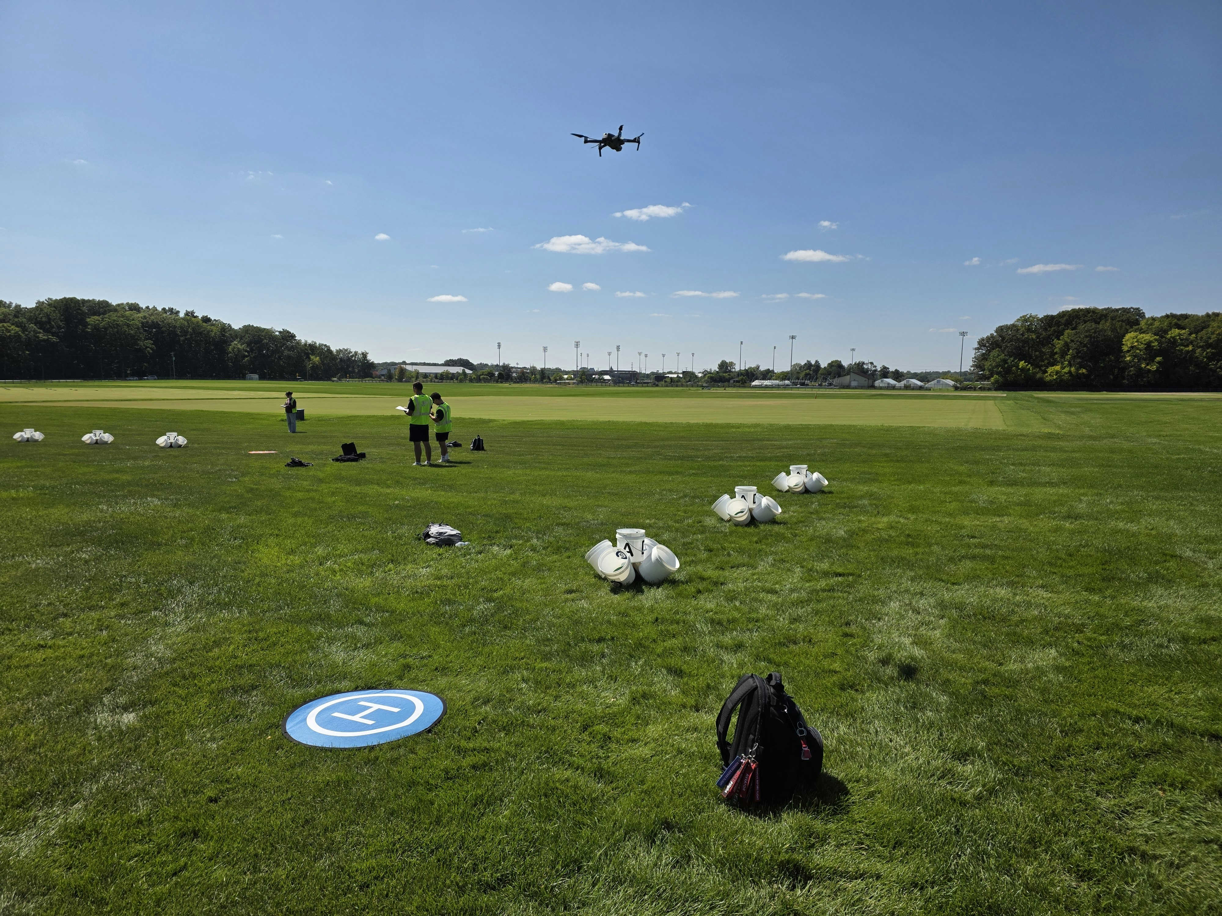 Our main base of operations was at the Purdue turf farm. This location had some hazards to be aware of like trees on the east and south side, electrical lines on the south side, and sports stadium lights on the west side. The ground was a little damp, but dry enough to have landscapers conduct normal operations like mowing.