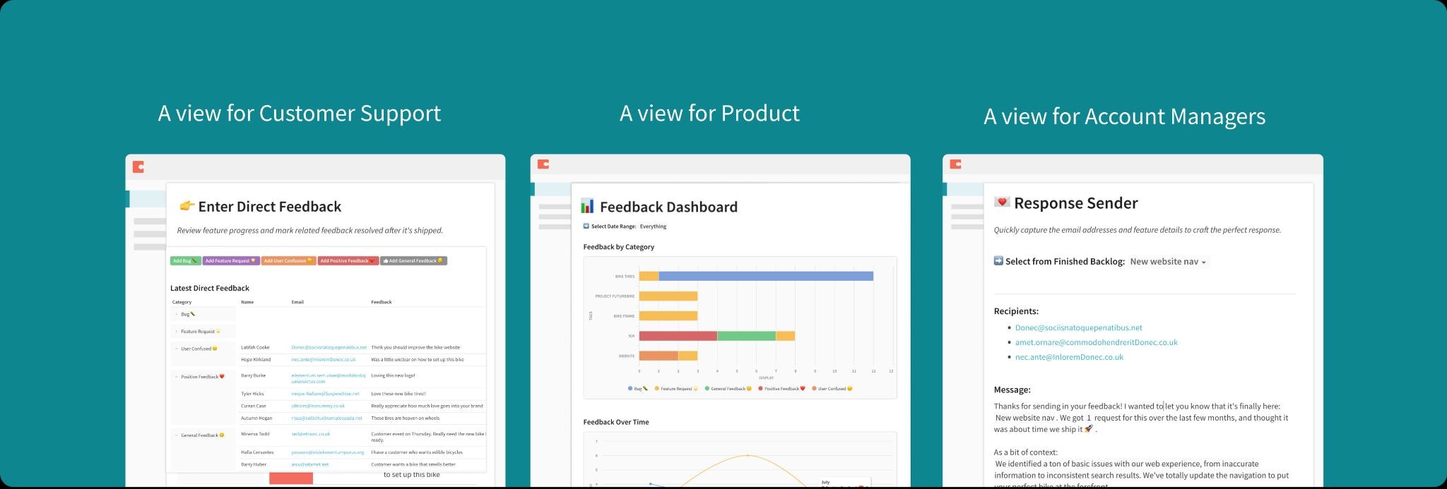 A Support team view, where someone can manually enter and tag feedback that may not have been captured elsewhere. If they can’t find the right tag for a comment, no problem — they can just click a button to create one on the spot. A Product team view, where you can quickly segment feedback based on date, category, tag, etc. It’s also where you can spot high-level trends over time and link any customer comment to a specific feature in development. An Account Manager View, where your client-facing team can see what the Product team has completed, and then pass on the good news back to the person who raised it.