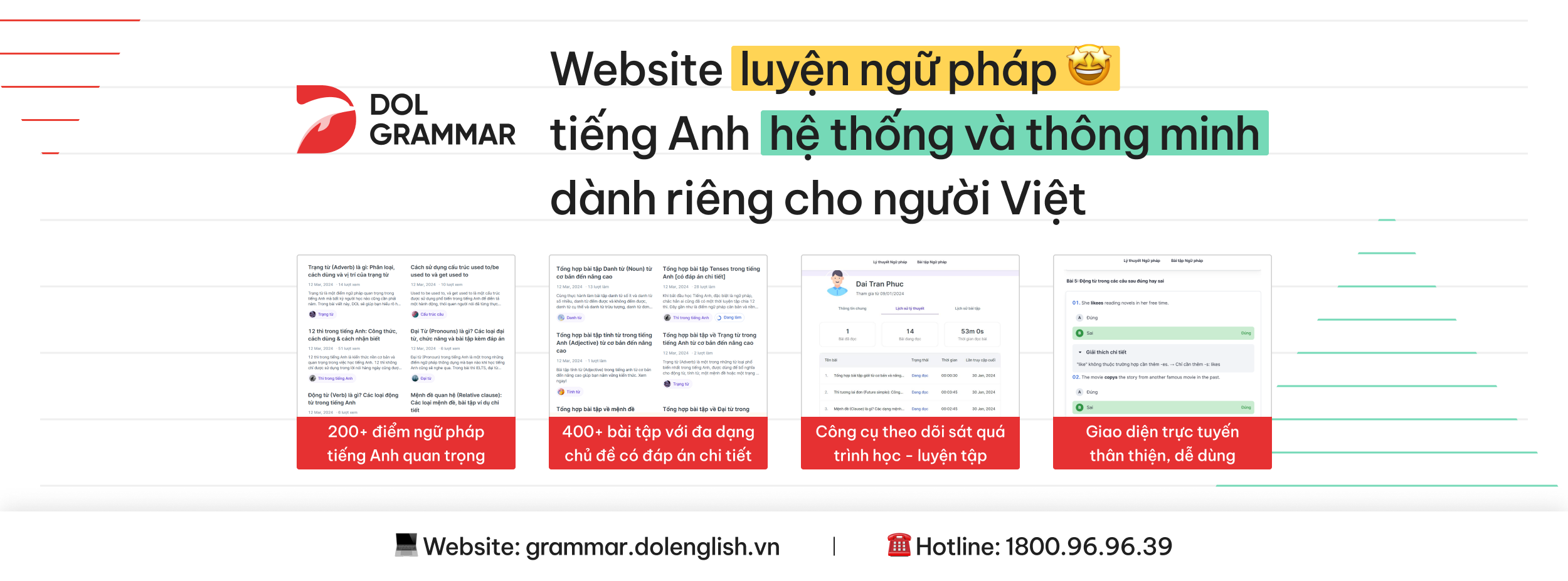 Sứ mệnh của chúng tôi là trở thành nguồn tài liệu miễn phí hàng đầu, giúp người học tiếng Anh phát triển kỹ năng ngữ pháp một cách dễ hiểu và hiệu quả. Ngoài ra, DOL Grammar còn tích hợp hệ thống theo dõi tiến độ học tập, giúp bạn đánh giá và cải thiện quá trình học một cách liên tục. Với sự hỗ trợ từ đội ngũ chuyên gia có kinh nghiệm, DOL Grammar cam kết mang đến cho bạn những công cụ và tài liệu hữu ích để tự tin sử dụng tiếng Anh trong mọi tình huống.