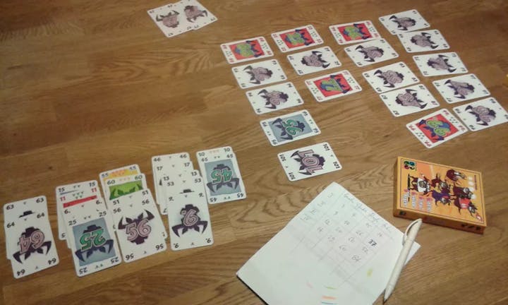 The Total number of bullheads shown on the cards in this separate deck is the score of the player. The player with the lowest score is the winner of the round. The round continues until all cards are played. When a round ends, we note everyone’s points, and start a new round. The first player to end a round with a total score above or equal to 66 bullheads loses.