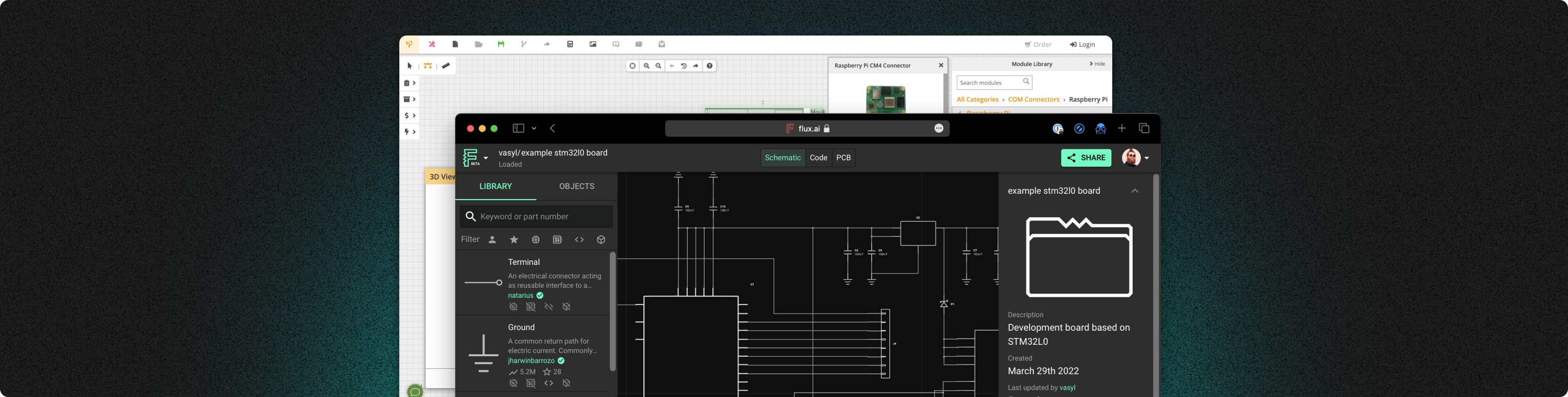 In Upverter, it’s difficult to find parts and projects to start with. Even when you find a reference project, you need to go through several steps to import the project, libraries, and everything you need to get started. In Flux, all public projects and parts can be forked and built upon with the click of a button. Similar to GitHub, Flux has been built with reusability in mind from the very beginning. Get started quickly forking these including templates for manufacturers, projects, parts, and modules. Flux makes it easy to go from prototype to custom PCB design using a for Arduino, Raspberry Pi, and ESP32 platforms and more. Sub-layouts are reusable blocks of traced PCB design that can also be used as a starting place for custom PCB designs using dev boards. . All-in-one workflow that stays in sync