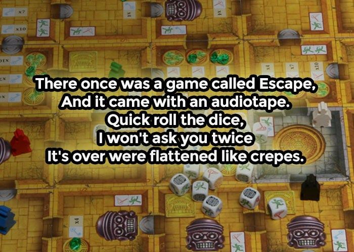 There once was a game called Escape,\nAnd it came with an audiotape.\nQuick roll the dice,\nI won't ask you twice\nIt's over we're flattened like crepes.\n#limerick #boardgames\nhttps://www.bestplay.co/board-game-limericks-volume-two/