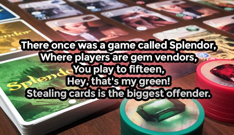 There once was a game called Splendor,\nWhere players are gem vendors,\nYou play to fifteen,\n"Hey, that's my green!"\nStealing cards is the biggest offender.