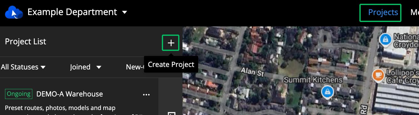 Select the “Projects” tab and create your first project. You have the flexibility to run all operations under one project or utilize different projects for specific locations/team members.