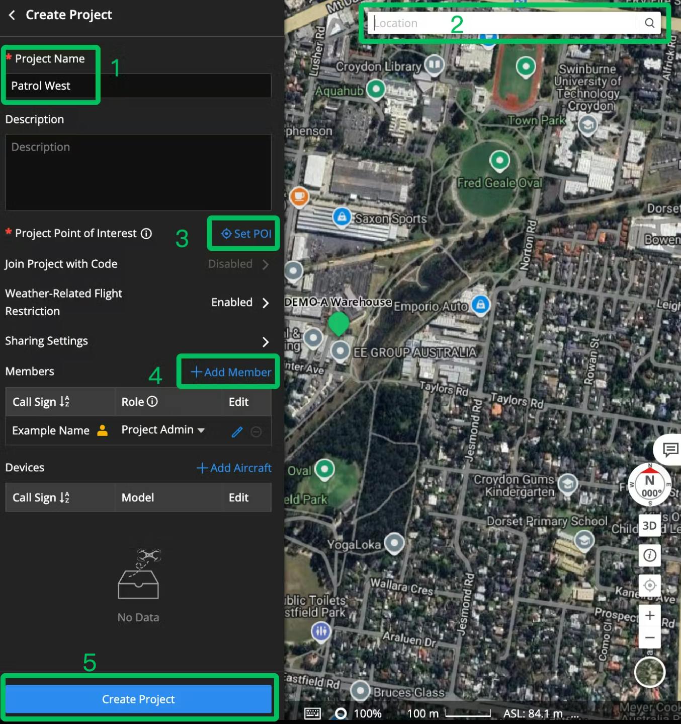 Can revisit project settings at any time by selecting the gear icon at the bottom left of your project Join Project with Code allows a member in the field to join the project without being added as a member. Weather Related Flight Restrictions applies to dock operations. Sharing Settings controls the ability of project members to share the live feed and/or media files After devices are added to the organization they can be associated with a project for organization