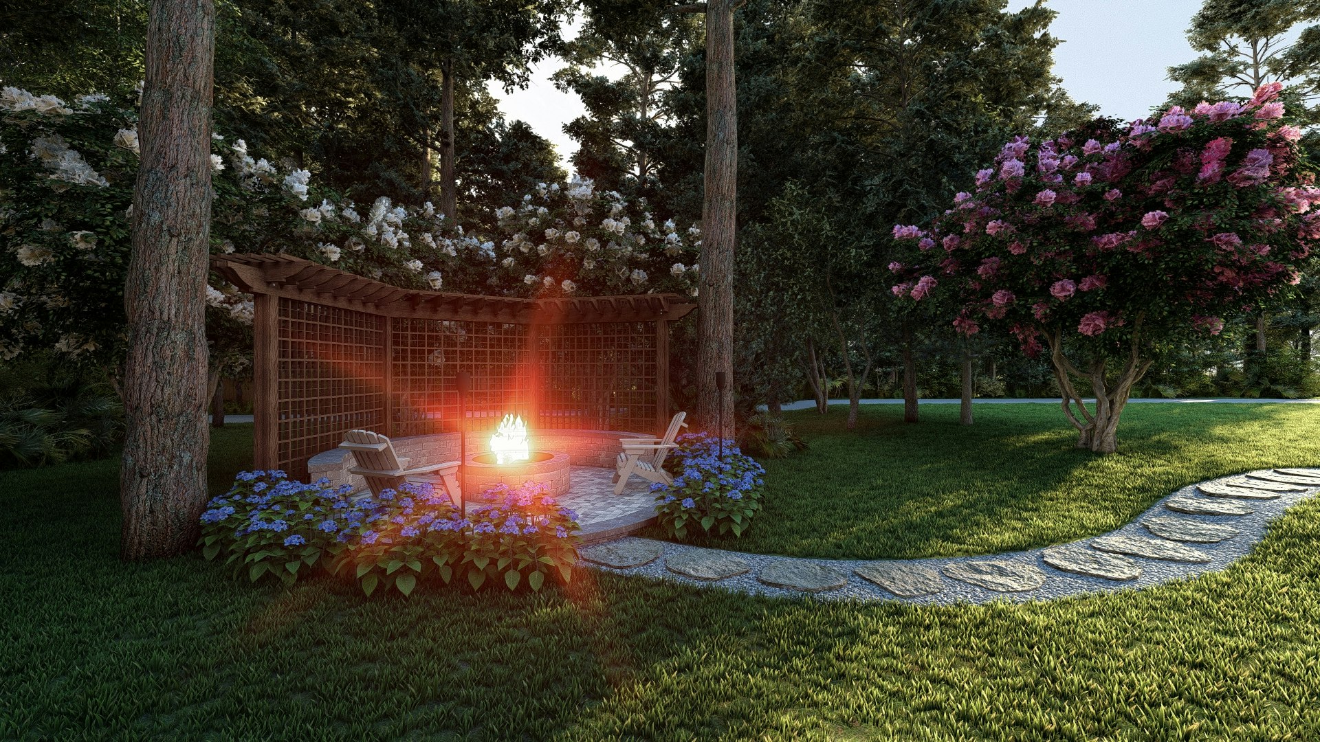 The overall goal is to add an outdoor kitchen to the existing screened in patio and to add a fire pit with a seating area in the back yard with a stepping stone path leading to it.
