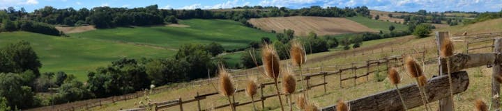 s'ouvre sur une prairie arborée avec vue sur la vallée de l'Auroue