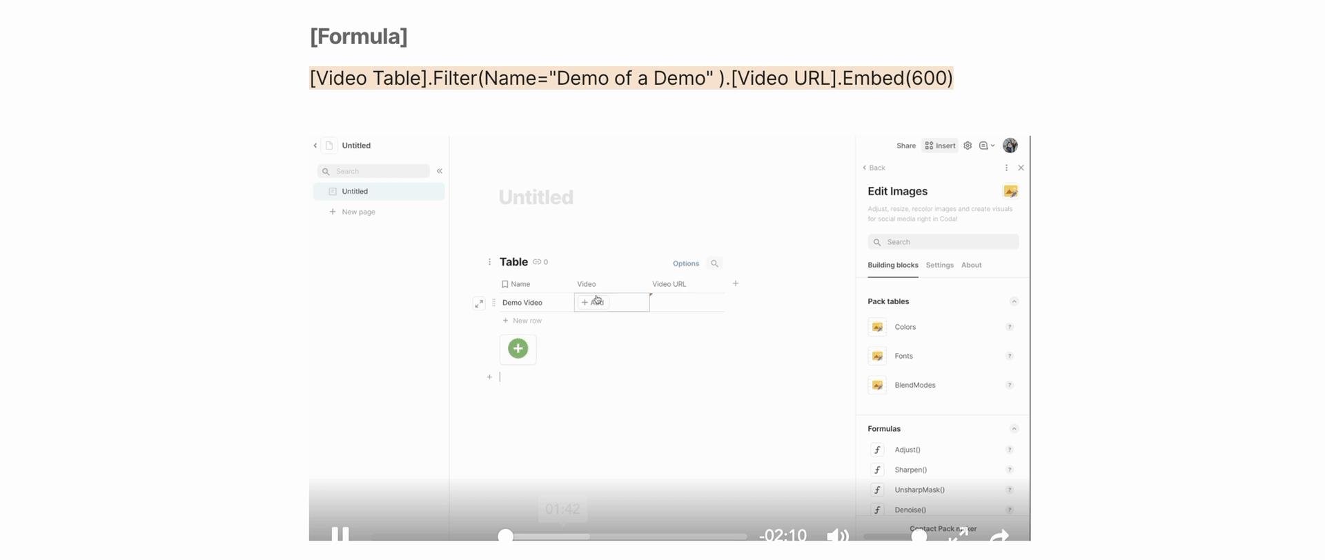 Because the video is static, the Name in the formula will be set to a static video title and the Embed(SIZE) will be set to a static amount.