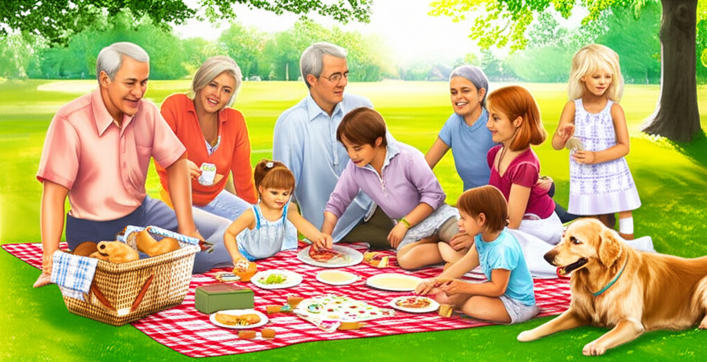 Based on the members present, what type of family could this picture represent, and why? What kinds of activities are the family members engaging in, and what does this suggest about family life? How do the different generations in the picture seem to interact with each other? ____________________________________________________________________________________________________________