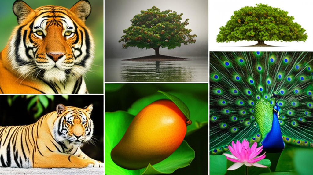 The national animal depicted in this collage is the Tiger, and the national bird is the Peacock.