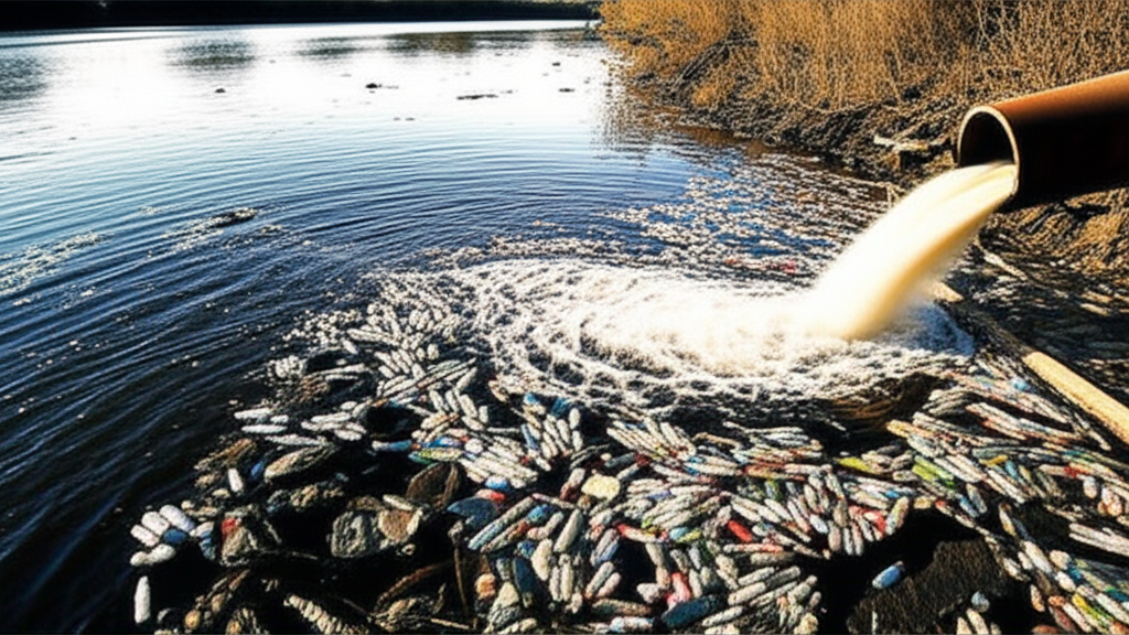 What type of pollution is primarily depicted in this image? List at least three sources or types of waste contributing to the pollution shown. What are the potential harms of this pollution to living beings? ____________________________________________________________________________________________________________