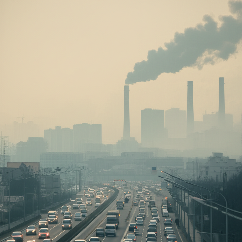 Which type of environmental pollution is prominently featured in this picture? Identify two main human activities contributing to this type of pollution as seen in the image. How does this pollution affect people’s health and the Earth’s temperature? ____________________________________________________________________________________________________________