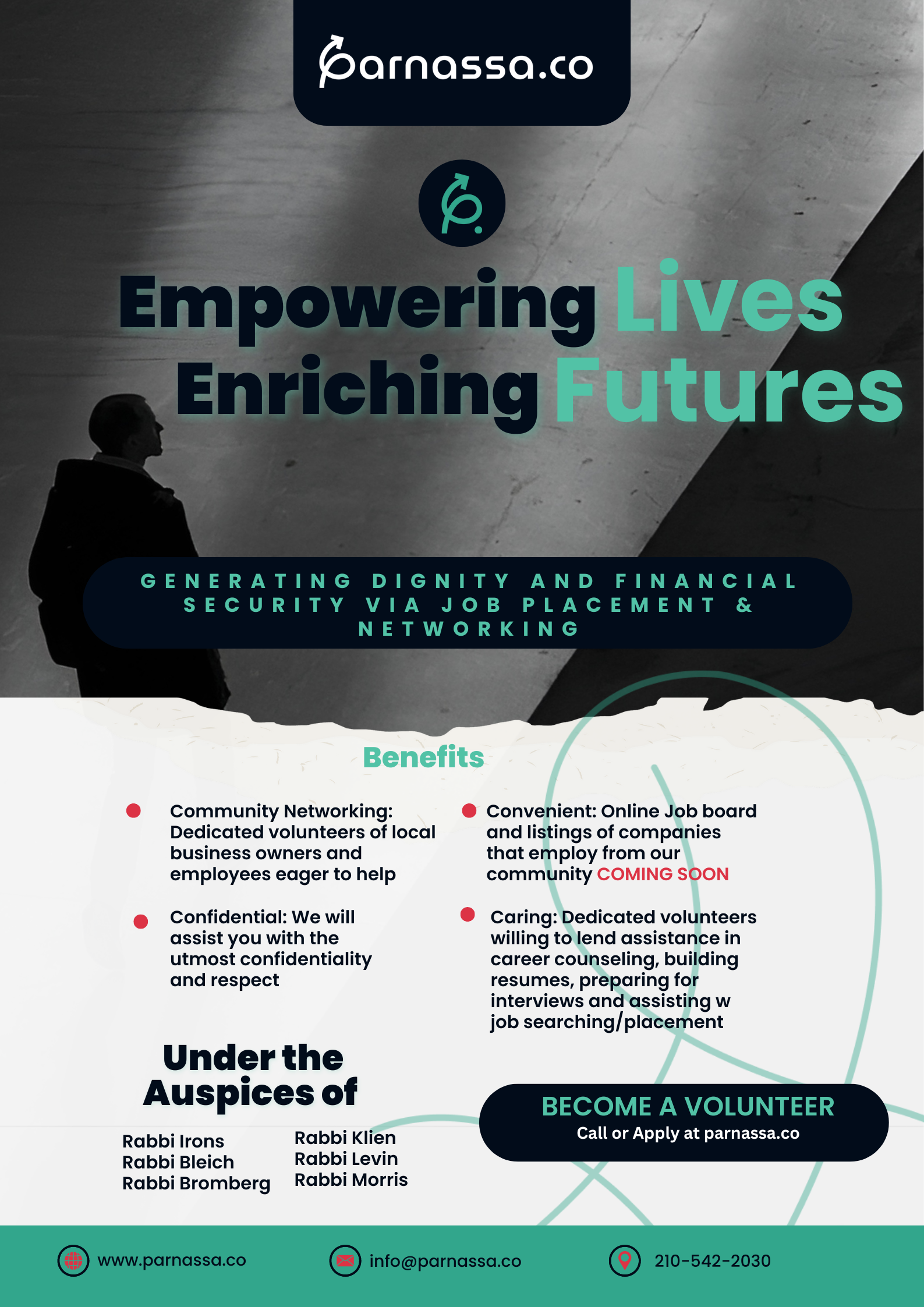 We will have a volunteer group of job connectors and coaches called ‘Parnassa Coaches’ (PCs). Each PC would be responsible for receiving inquiries from the Central Job Matcher based on the job seeker’s preferences and would reach out to the job seeker directly to help find a position within their desired industry, while also serving as a business coach (resume assistance / interview preparation as needed).