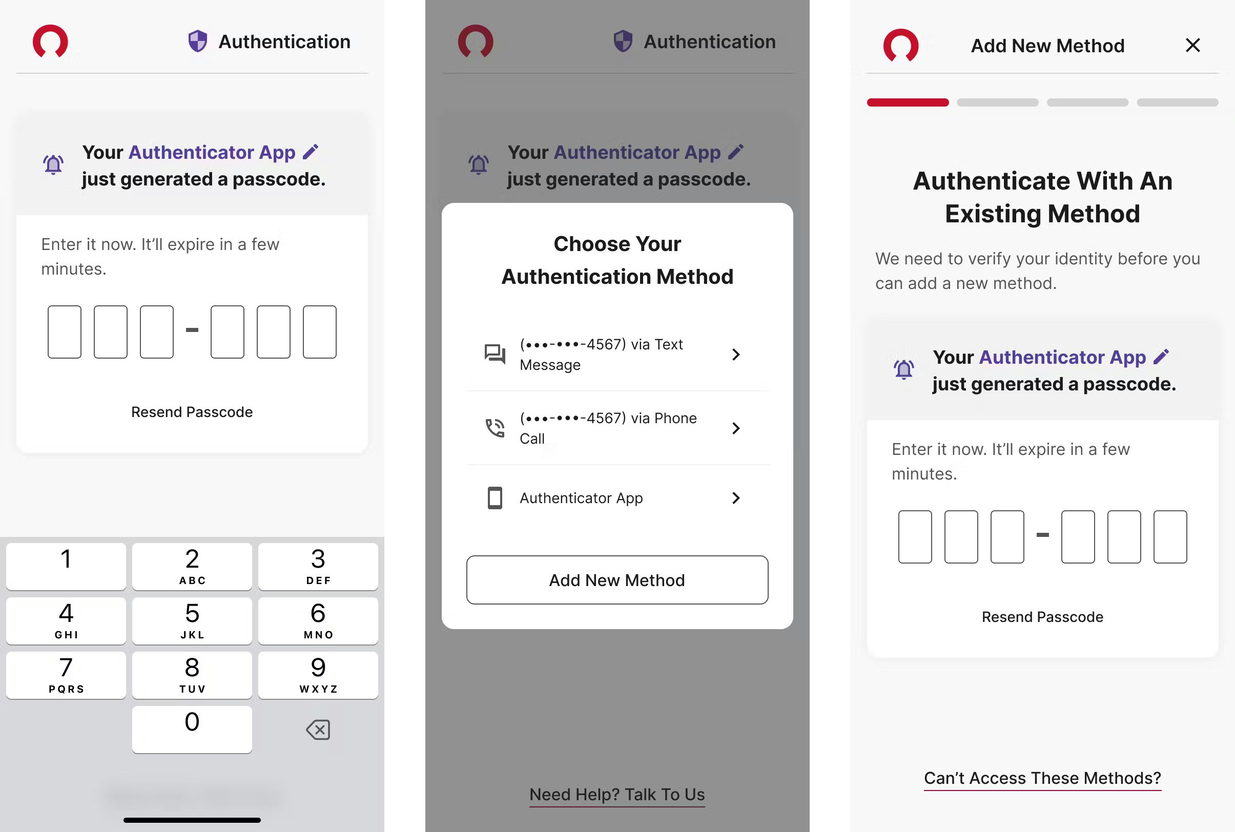 Different headers and the introduction of a stepper clearly indicates which process the client is going through. The client can exit the “add new method” process at any time.