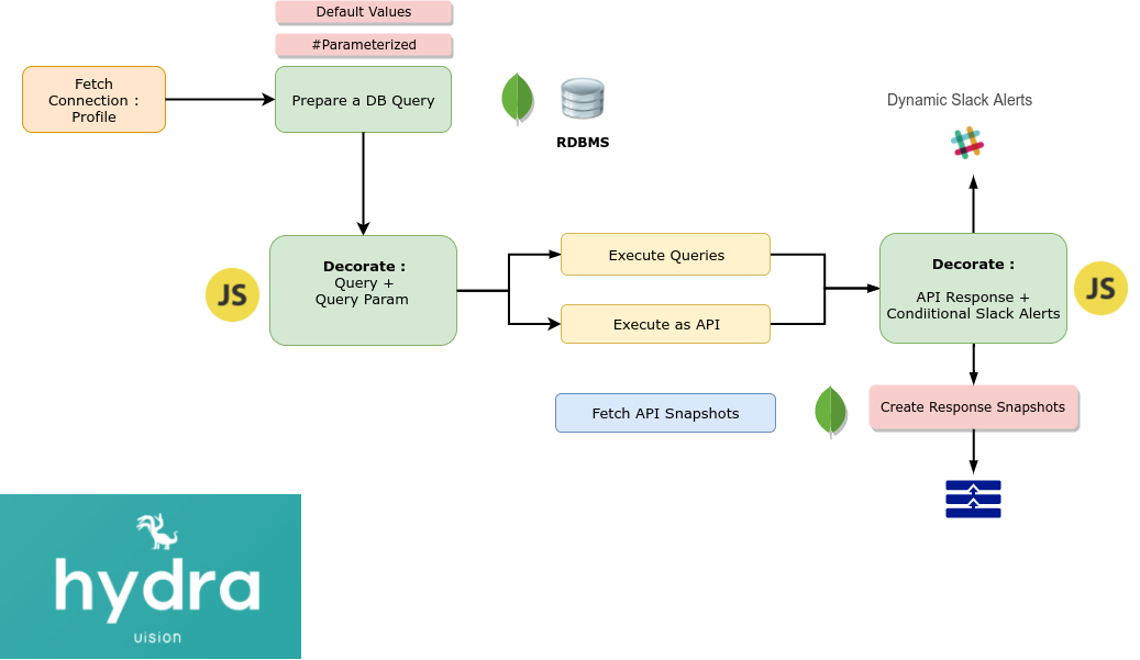 Pass in a database query (SQL or Mongo) to generate an API, with support for parameters. Add in a Javascript code to trasform the parameters or query results, and save a version of the response to create a point-in-time snapshots (data versioning). Hydra : Workflow