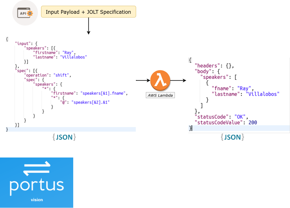Portus is a service to transform an incoming JSON payload from one schema to another, by passing in a specification, at runtime. Its a web service built on top of the open source library . Portus : Workflow