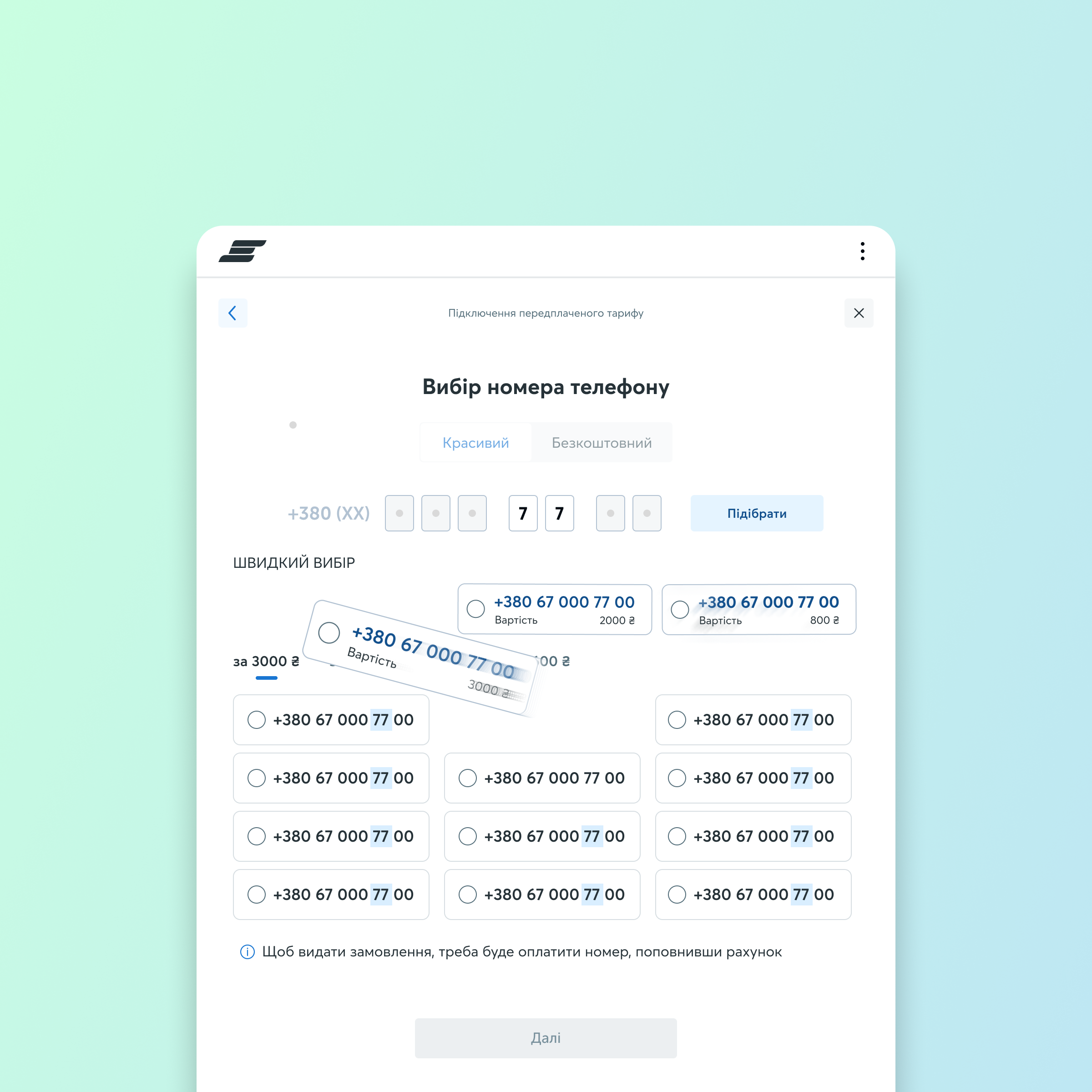 для зручності підбору достатньо залишити маску де продавець або клієнт може ввести будь-яку комбінацію підключення та вибір звичайного або красивого номера мають відбуватися в одному флоу продавець та клієнт має бачити скільки коштуватиме вибраний номер
