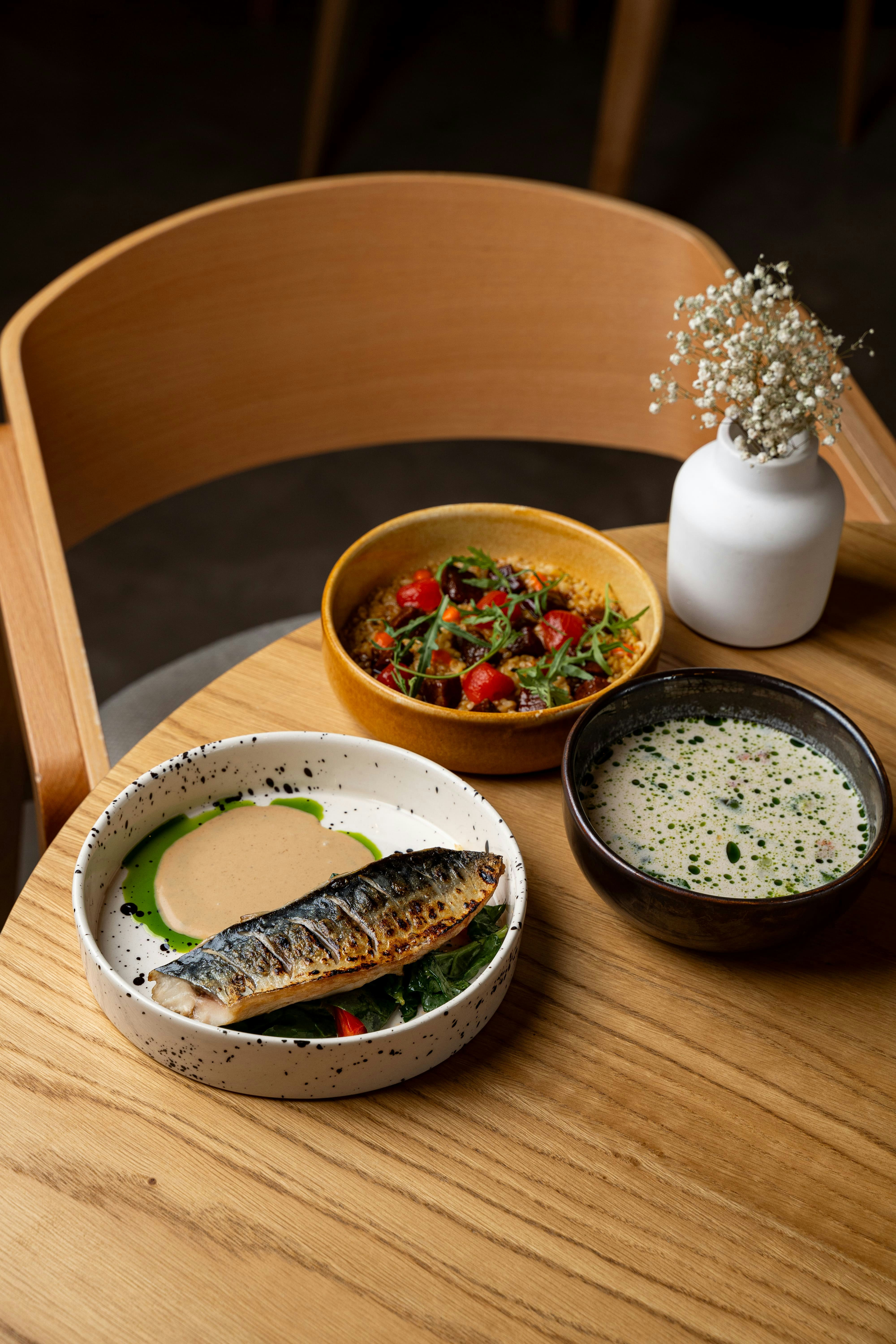 Шпинат, помидоры черри, макрель, соус Берблан (лук репчатый, чеснок, малиновый уксус, сливки, соус рыбный), рыбный бульон, лук зеленый, чеснок, тимьян, белое вино, уксус винный, фенхель