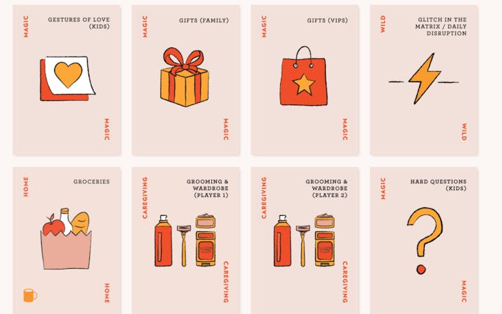 The Wild suit includes life-changing scenarios that rock your world, and come with a mind-numbing amount of invisible work. When you’re dealt a Wild card (hopefully temporarily), you’re entitled to ask for additional help from your partner guilt-free. Your partner is encouraged to reach out to your village for even more support, but the Wild cardholder is not the one who handles this delegation. You and your partner are also encouraged to remove cards from your deck, temporarily, while dealing with a Wild card.