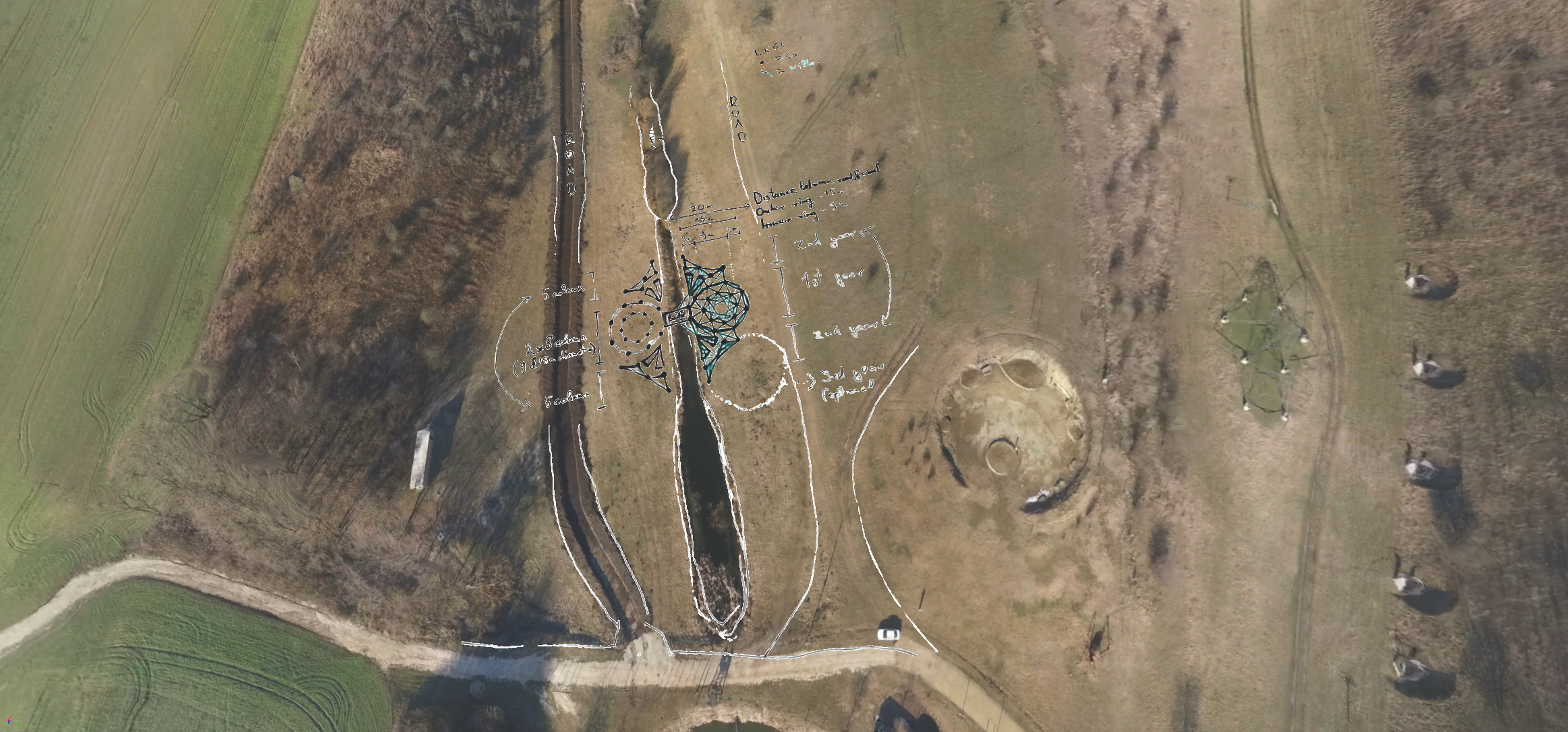 Október-December - Ötletelés, fantáziálás, szervezés Január 11. - Első konkrét egyeztetés, Terepszemle, Drónozás & 3D modellezés Február 3. - Terület kijelölése, Hollandokkal terepszemle Február 14. - Előzetes tervezet elküldése Február 23.-ig - Visszajelzés, változtatási javaslatok tőletek Március 1.-ig - Végleges tervezetet küldünk Március első hete - Utolsó finomítások a terveken, munkafázisok és önkéntesek szervezésének megkezdése Március 17.-ig - Oszlopok helyének kijelölése (Lehetőség szerint híd építése, azonban akár másik évre is lehet ütemezni) Március 18. - Terület előkészítésének és oszlopok felállításának befejezése Március 19-28. között - Fűz struktúra építése önkéntesek bevonásával Szükséges alapanyagok: