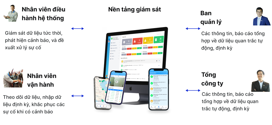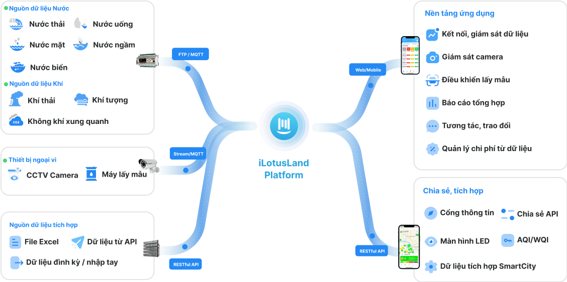 Dữ liệu tại các hệ thống quan trắc nước thải được kết nối với bộ truyền thông dữ liệu và truyền về máy chủ trung tâm và hiển thị trên phần mềm iLotusLand. Dữ liệu hình ảnh camera tại các hệ thống quan trắc, camera an ninh… cũng có thể truyền về trung tâm và hiển thị trên phần mềm . Phần mềm trung tâm (iLotusLand for Environment) trên điện thoại và máy tính cung cấp các công cụ phục vụ cho mục đích xử lý dữ liệu, lập báo cáo, quản trị hệ thống, điều khiển, giám sát và cảnh báo. Dữ liệu chất lượng môi trường sau khi về phần mềm trung tâm thì có thể phục vụ cho việc quản lý và giám sát, trích xuất, chia sẻ thủ công, chia sẻ tự động cho các cơ quan chức năng hoặc chia sẻ cho các ứng dụng khác của Chủ đầu tư