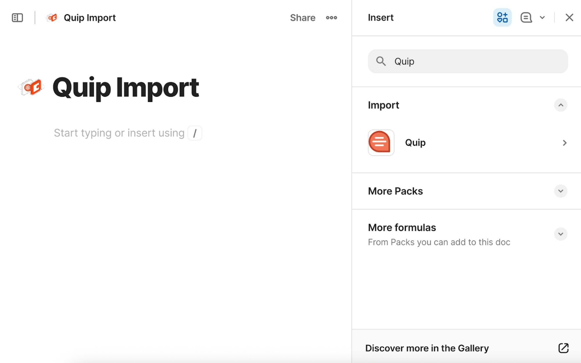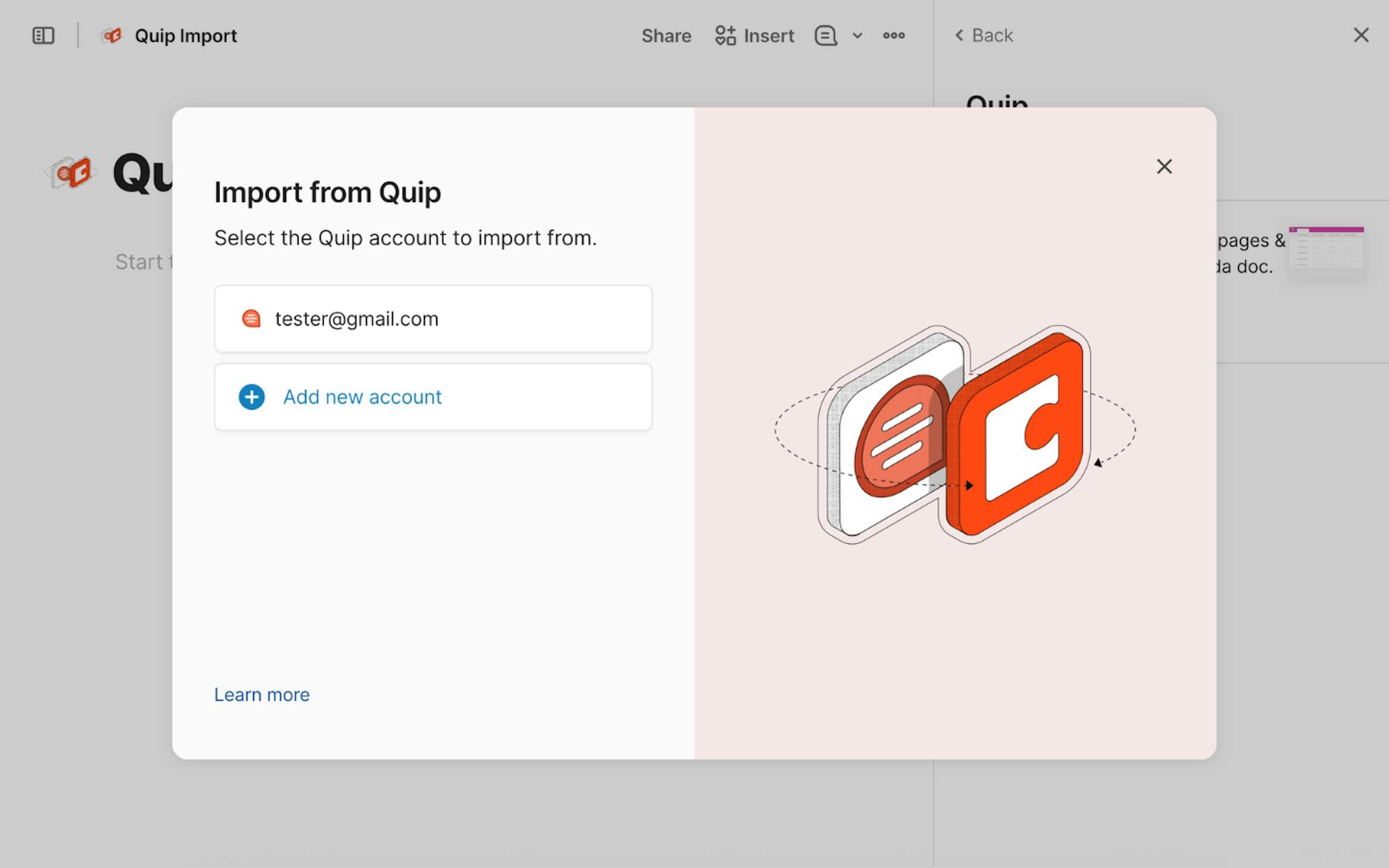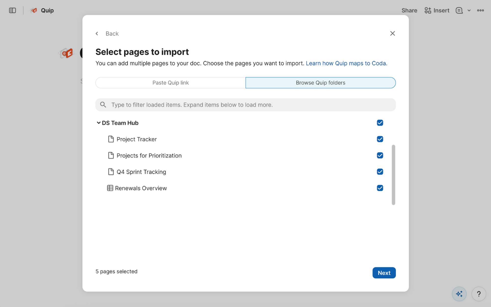 - Select “Quip” and choose Import from Quip.
