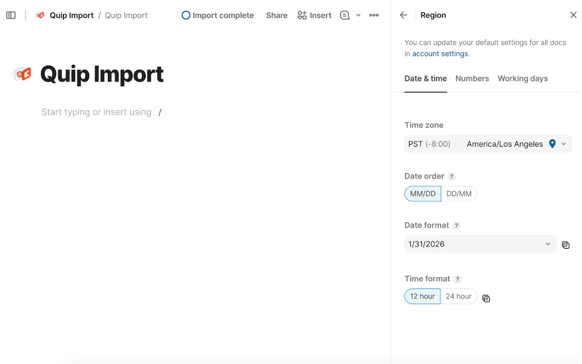 Confirm your Coda doc is set to the correct time zone. Coda uses the doc’s time zone to interpret date and time values. If the time zone doesn’t match what your team used in Quip, some dates or timestamps may look shifted once your content lands in Coda. You can review or update the time zone from the doc settings menu in Coda at any time before running the import.