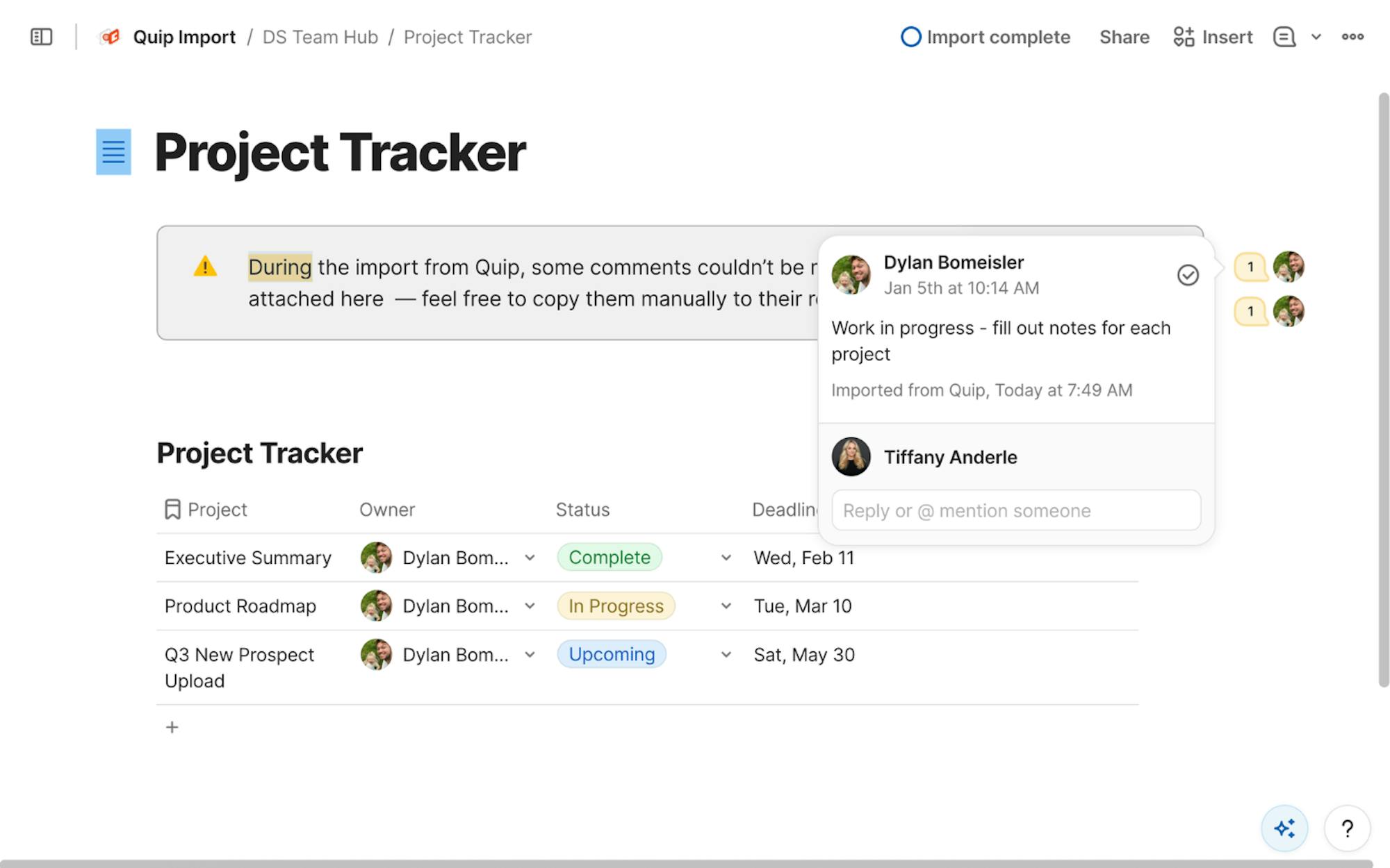 Coda also takes care of mapping people for you. During the import, users are matched to Coda accounts based on email addresses, so ownership, comments, @mentions, and person references stay intact. If a Quip user already exists in your Coda workspace with the same email address, Coda automatically links the imported content to that user. If a Quip user doesn't exist in Coda yet, Coda creates a placeholder using their email address. This keeps comments, mentions, and person fields intact even before the user joins. Once you invite that person to your workspace, Coda automatically replaces the placeholder with the real user and updates all references.What doesn’t import