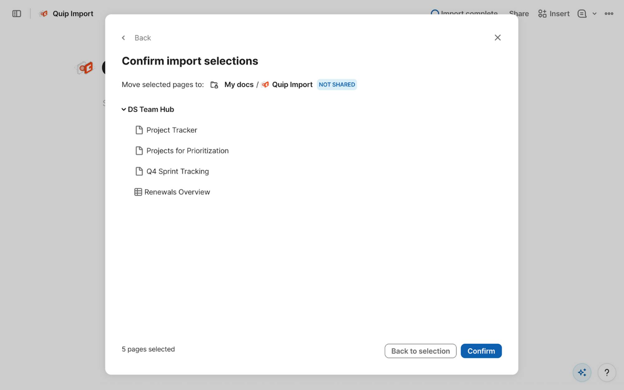 You have two ways to choose what to bring over from Quip. You can browse your folders to import an entire workspace, or paste a direct link to import a specific document or folder. Pick the option that best fits how you organize your content; both lead to the same import experience.4. Select content to import