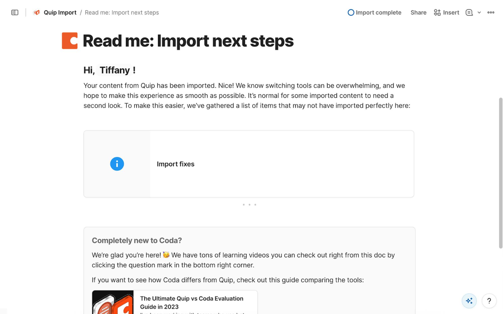Once the import finishes, you’ll see a confirmation message letting you know everything has been brought into Coda. From here, you can open the imported doc and start exploring your content. Imports don’t modify your Quip workspace. If you ever need to retry, you can delete the imported Coda doc and run the import again without affecting your original content.Review your imported content